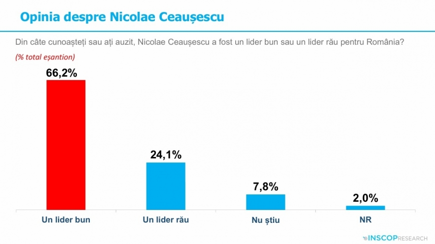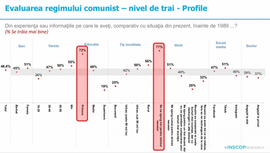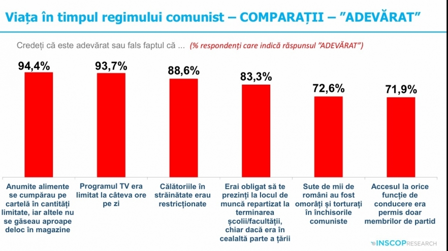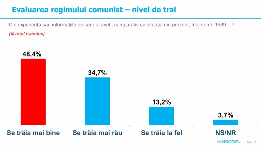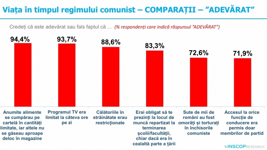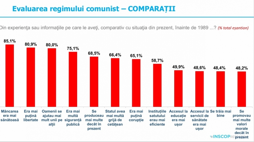 Potrivit ultimului sondaj privind nostalgia față de comunism, publicat în vara lui 2025 de INSCOP, peste 55 la sută dintre români consideră că perioada comunistă a fost benefică țării - în mai mare măsură reznonează cu această perspectivă persoanele de peste 60 de ani, cele cu educație primară, locuitorii din urbanul mic sau rural și persoanele cu un venit mai redus - deși în proporție de peste 80 la sută oamenii admit că nu s-au bucurat de libertatea pe care o au în democrație.